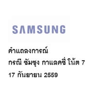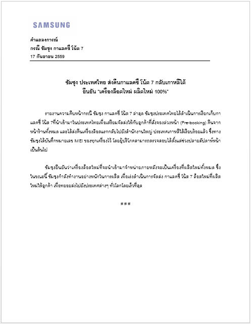 รายงานความคืบหน้ากรณี ซัมซุง กาแลคซี่ โน้ต 7 ล่าสุด ซัมซุงประเทศไทยได้ดำเนินการเรียกเก็บกาแลคซี่ โน้ต 7ที่นำเข้ามาในประเทศไทยเพื่อเตรียมจัดส่งให้กับลูกค้าที่สั่งจองล่วงหน้า (Pre-booking) คืนจากหน้าร้านทั้งหมด และได้ส่งคืนเครื่องล๊อตแรกกลับไปยังสำนักงานใหญ่ ประเทศเกาหลีใต้เรียบร้อยแล้ว ซึ่งทางซัมซุงได้บันทึกหมายเลข IMEI ของทุกเครื่องไว้ โดยผู้บริโภคสามารถตรวจสอบได้ตั้งแต่ช่วงปลายสัปดาห์หน้าเป็นต้นไป