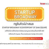 ทรู อินคิวบ์ โปรแกรมบ่มเพาะผู้ประกอบการไทยด้านเทคโนโลยี (Tech Startup) ของกลุ่มทรู ภายใต้ระบบนิเวศน์สมบูรณ์แบบ จัดกิจกรรม Startup Broadway ร่วมฟังการบรรยายพิเศษโดยเทคกูรูจากบริษัทชั้นนำ ที่จะมาให้ความรู้ในหัวข้อต่างๆ อาทิ เทคนิคชนะใจลูกค้าในยุคดิจิทัล พร้อมพบปะเหล่าสตาร์ทอัพที่มาร่วมเปิดบูธแนะนำธุรกิจหลากหลาย อาทิ GetLinks สตาร์ทอัพด้านดิจิทัล เทค, Sell Suki สตาร์ทอัพด้านอี-คอมเมิร์ซ ร่วมด้วยเหล่าสตาร์ทอัพด้านฟินเทค, ฟู้ด-แอคริ เทค, และไลฟ์สไตล์ เทค เป็นต้น นอกจากนี้ เปิดโอกาสในการสร้างเครือข่ายชุมชนสตาร์ทอัพกับผู้เข้าร่วมงาน ทั้งจากหน่วยงานภาครัฐ มหาวิทยาลัย องค์กรเอกชน และกลุ่มผู้ลงทุน (Venture Capital) อีกด้วย เหล่าสตาร์ทอัพ และผู้สนใจเชิญร่วมกิจกรรม Startup Broadway ได้ฟรี โดยไม่เสียค่าใช้จ่าย ในวันอังคารที่ 27 กันยายน 2559 เวลา 15.00-17.00 น. ณ อินคิวบ์ สเปซ ชั้น 4 เซ็นเตอร์พอยท์ ออฟ สยามสแควร์