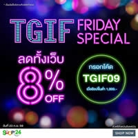 Shopat24.com แจกกระหน่ำรับวันศุกร์ โค้ดส่วนลดสุดคุ้ม 8% ทั้งเว็บ เพียงกรอก TGIF09 เมื่อมียอดซื้อขั้นต่ำ 1,000 บาท เลือกช้อปจุใจกับสินค้ามากมายกว่า 30,000 รายการ พิเศษสุดๆ เฉพาะวันที่ 23 กันยายน 2559 นี้เท่านั้น ห้ามพลาด บริการจัดส่งฟรีที่เซเว่นอีเลฟเว่นทุกสาขา