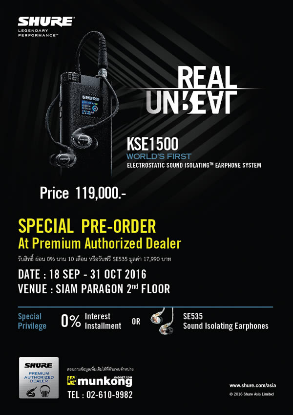 SHURE มอบโปรโมชั่นสุดพิเศษ เมื่อ PRE-ORDER SHURE KSE1500 รับสิทธิ์พิเศษ ผ่อน 0% นาน 10 เดือน หรือ รับฟรี SHURE SE535 มูลค่า 17,990 บาท เฉพาะที่ร้าน Munkong Gadget เท่านั้น!!!