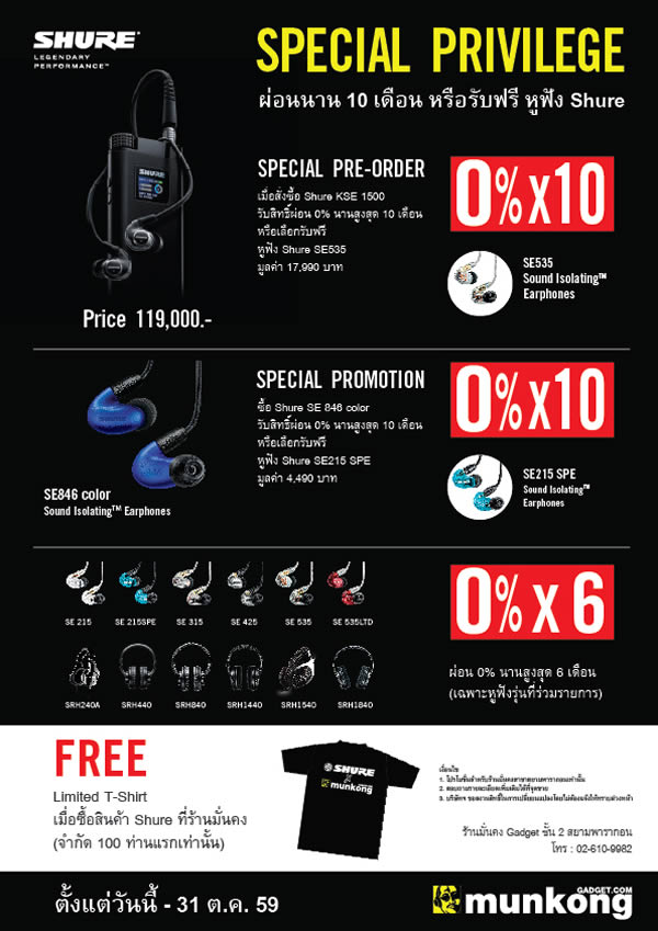 และสำหรับท่านที่ซื้อหูฟัง Shure 100 ท่านแรก รับฟรีทันทีเสื้อ MUNKONG X SHURE LIMITED