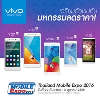 ในปีนี้ส่งท้ายงาน Thailand Mobile Expo 2016 Vivo จัดสมาร์ทโฟนระดับคุณภาพให้คุณได้เลือกกันหลากรุ่นหลายสไตล์ พร้อมกิจกรรมและโปรโมชั่นที่จัดขึ้นภายในบูธมากมาย โดยสิทธิพิเศษที่คุณจะได้รับภายในงาน ซื้อ 1 ได้ถึง 2 เพียงซื้อมือถือ Vivo รุ่นใดก็ได้ภายในงาน รับสิทธิ์จับฉลาก โดยลุ้นของรางวัลคือ สมาร์ทโฟน Vivo, หูฟัง Jaben, ไม้เซลฟี่ ทันทีตลอดงาน พร้อมทั้งรับสิทธิ์ส่วนลดหูฟัง JaBen สูงสุดถึง 10% เพียงแสดงใบเสร็จเมื่อซื้อสมาร์ทโฟนวีโว่ ที่บูธ Jaben โดยมีโปรโมชั่นสมาร์ทโฟนหลายรุ่นมากมายภายในบูธ