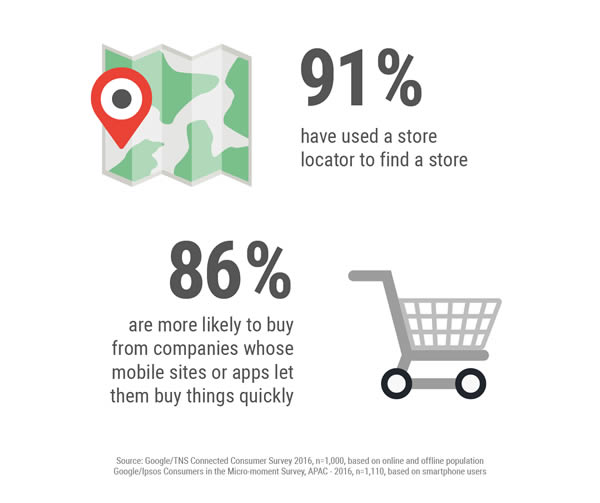 โมบายล์ช่วยผู้บริโภคให้ทำสิ่งที่จำเป็น เช่น มองหาเส้นทางและโทรศัพท์สอบถามร้านค้าที่ตนเองต้องการไปอุดหนุน ซึ่งในประเทศไทยเรื่องนี้มีความเป็นจริงมากที่ 91% ของผู้ใช้สมาร์ทโฟน ซึ่งเป็นสัดส่วนที่สูงที่สุดในภูมิภาคเอเชียแปซิฟิก ได้ใช้ฟีเจอร์ระบุตำแหน่งร้านค้า โมบายล์ไม่เป็นเพียงการพาลูกค้าไปที่ร้านเท่านั้น แต่มันยังนำประสบการณ์ต่อไปจนถึงกระบวนการเช็คเอ้าท์หรือจ่ายเงิน 43% ของผู้ใช้สมาร์ทโฟนไทยไปที่ร้านค้าหลังจากเห็นข้อความเกี่ยวกับธุรกิจนั้นๆ ผ่านทางสมาร์ทโฟน และมีคนไทยจำนวนสูงถึง 91% ที่ยังใช้สมาร์ทโฟนเป็นผู้ช่วยต่อไปในขณะที่อยู่ในร้าน