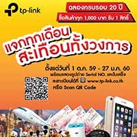 TP-Link ผู้นำด้านนวัตกรรมอุปกรณ์เน็ตเวิร์คสำหรับบ้าน และธุรกิจขนาดเล็กและขนาดกลาง เปิดเผยว่า เนื่องในโอกาสที่บริษัทฉลองครบรอบ 20 ปี ได้จัดโปรโมชั่น “แจกทุกเดือน สะเทือนทั้งวงการ” เมื่อซื้อสินค้าทุก 1,000 บาท รับ 1 สิทธิ์เพียงนำใบเสร็จมาลงทะเบียนที่ http://tp-link-thaiforum.com/promotion2/register/index.php จับรางวัลรายเดือนและรางวัลใหญ่ช่วงสิ้นปี