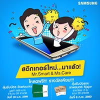หลังจากเปิดตัว “Samsung Thailand LINE Official Account” พร้อมสติกเกอร์ “Mr.Smart & Ms.Care” ให้ขาแชตได้โหลดสนุกแชตสนั่นกันไปแล้วถึง 2 เวอร์ชั่น พร้อมกระแสตอบรับที่ดีเกินคาด เพราะมียอดดาวโหลดสติกเกอร์มากกว่า 9.7 ล้านครั้ง ครั้งนี้ซัมซุงเลยขอส่งสติกเกอร์ไลน์ “Mr.Smart & Ms.Care” เวอร์ชั่นใหม่ น่ารักสดใสเช่นเคย พร้อมข้อความโดนๆ ให้ชาว LINE ได้ดาวน์โหลดฟรีแล้ว ตั้งแต่วันนี้ ถึง 22 ก.พ. นี้เท่านั้น