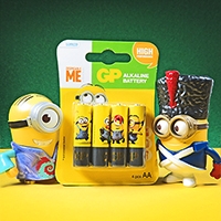 GP BA-NA-NA Marathon Power ถ่านอัลคาไลน์ที่ออกแบบมาอย่างแตกต่างไม่เหมือนใคร ด้วยลวดลายจาการ์ตูนดังมินเนี่ยน (Minions) ที่ได้รับลิขสิทธิ์อย่างถูกต้องตามกฎหมายจาก Universal Studios ซึ่งมาพร้อมกับความน่ารักของมินเนี่ยนในอิริยาบถต่างๆ เหมือนดังในการ์ตูน แถมตัวถ่าน และแพ็คเกจยังมีสีเหลือง สีที่เป็นเอกลักษณ์ของมินเนี่ยน โดยมีลวดลายให้เลือกถึง 8 แบบที่แตกต่างกัน