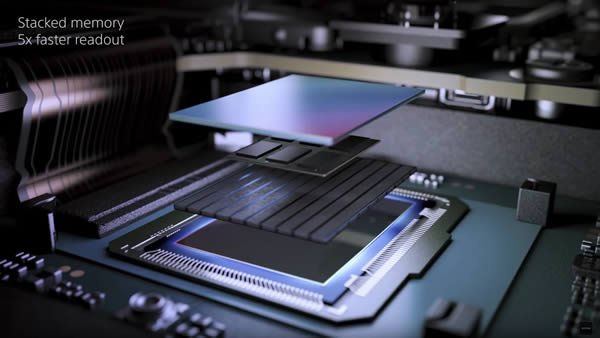 รูปเปรียบเทียบเซ็นเซอร์รับภาพ CMOS ทั่วไปที่มี 2 ชั้น (ซ้าย) และเซ็นเซอร์รับภาพ CMOS แบบใหม่ของ Sony ที่มี 3 ชั้น โดยเพิ่ม DRAM แทรกมาระหว่างกลาง (ขวา)