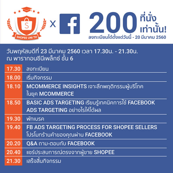 Shopee ผู้นำตลาดซื้อขายบนมือถือในเอเชียตะวันออกเฉียงใต้และไต้หวัน เตรียมจัดเวิร์คช็อป “ช้อปปี้ ยูนิเวอร์ซิตี้ x เฟซบุ๊ค: เพิ่มยอดขายออนไลน์” ในวันพฤหัสบดีที่ 23 มีนาคม พ.ศ.2560 เวลา 17.30 - 21.30 น. ณ โรงภาพยนตร์ที่ 12 พารากอน ซีนีเพล็กซ์ ชั้น 6 ศูนย์การค้าสยามพารากอน เพื่อให้ความรู้เกี่ยวกับทักษะการตลาดที่จำเป็นผ่านช่องทางออนไลน์