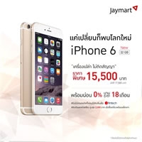 Jaymart ปรับราคาให้ถูกลงอีกแล้วสำหรับ iPhone 6 รุ่นความจุ 32GB ที่หลายตัวแทนจำหน่ายก็เริ่มนำมาให้จับจองกัน ทว่าเจมาร์ทมอบราคาพิเศษให้เหลือเพียง 15,500 บาทเท่านั้นแบบไม่มีข้อผูกมัดติดสัญญาใดๆ ให้กวนใจ ทั้งรับสิทธิ์ผ่อน 0% นานสูงสุด 18 เดือนกับบัตรเครดิตที่ร่วมรายการ และก็ยังมีโปรโมชั่นอื่นๆ น่าสนใจอีกด้วยเมื่อซื้อ iPhone อาทิ รับส่วนลดอุปกรณ์เสริมสูงสุด 50%, รับฟรีประกันจอแตกนาน 6 เดือนเมื่อติดฟิลม์ตามเงื่อนไข, เปลี่ยนเครื่องใหม่ 25 วันภายใต้ข้อกำหนดหรือเปิดแพ็กเกจก็รับส่วนลดอีก 2,000 บาท