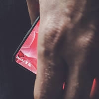 จากภาพจะเห็นสมาร์ทโฟนในมือบางส่วนที่มีดีไซน์การออกแบบหน้าจอไร้ขอบเป็นจุดเด่น โดยขนาดของหน้าจอโดยรวมถือว่าค่อนข้างเล็กและสามารถหยิบจับได้ด้วยมือข้างเดียวและชวนให้นึกถึงสมาร์ทโฟนจอไร้ขอบอย่างรุ่น Xiaomi Mi Mix