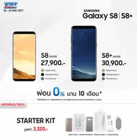 Samsung Galaxy S8 ในราคา 27,900 และ S8+ ราคา 30,900 ผ่อนนาน 0% กับบัตรที่ร่วมรายการ นอกจากนี้ เมื่อซื้อสินค้าภายในงานจะได้รับฟรี! ชุด Starter Kit มูลค่ากว่า 3,320 บาท ประกอบด้วย Clear Cover, Screen Protector, Battery Pack, C Type Gender