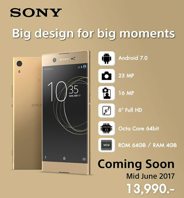 Sony ประกาศเริ่มวางจำหน่ายสมาร์ทโฟนรุ่น Xperia XA1 Ultra อย่างเป็นทางการแล้ว โดยเริ่มให้จับจองเป็นเจ้าของในกลางเดือนมิถุนายนราคา 13,990 บาท มาพร้อมจุดเด่นกล้องหน้าความละเอียด 16 ล้านพิกเซลและมีระบบป้องกันภาพสั่นไหว (OIS) (คลิกอ่านรายละเอียดข่าวเพิ่มเติม)
