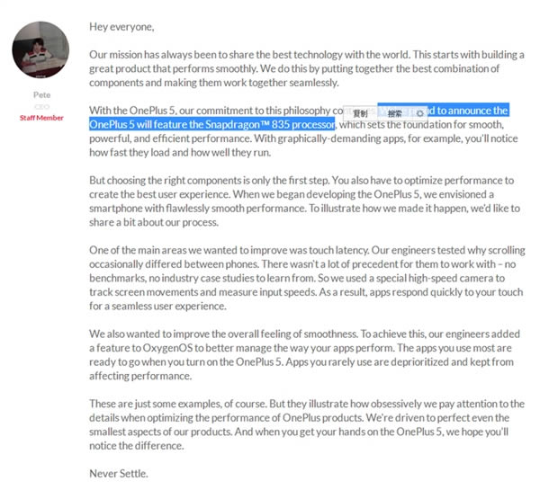 นี่ไม่ใช่ครั้งแรกที่ Peter Lau ออกมาเผยข้อมูลเกี่ยวกับ OnePlus 5 ซึ่งก่อนหน้านี้เขาเคยบอกใบ้ว่าสมาร์ทโฟนรุ่นนี้จะมีตัวเครื่องที่บางลงกว่ารุ่นก่อนและใช้งานชิปเซ็ต Snapdragon 835