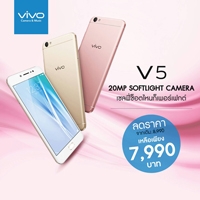 Vivo V5 มาพร้อมกับราคาใหม่ ซึ่งได้กระแสตอบรับเป็นอย่างดีเยี่ยมสำหรับคนชอบการถ่ายเซลฟี่ ใน Vivo V5 มีจุดเด่นคือ กล้องหน้า 20 ล้านพิกเซล และแสง Softlight ที่ช่วยสร้างเอฟเฟกต์แสงระดับสตูดิโอถ่ายภาพมืออาชีพ ที่มาพร้อมกับ หน้าจอแสดงผลแบบ IPS HD ขนาด 5.5 นิ้ว ความละเอียด 1280x720 พิกเซล โดยมี (RAM) ขนาด 4GB (ROM) ขนาด 32GB รองรับหน่วยความจำเสริมแบบ microSD สูงสุด 128GB สามารถปลดล็อคเครื่องด้วยการสแกนลายนิ้วมือ มีทั้งหมด 2 สี คือ สีโรสโกล ( Rose Gold ) และสีทอง ( Gold ) โดยจะเริ่มลดราคาตั้งแต่วันนี้เป็นต้นไป จาก 8,990 บาท เหลือเพียง 7,990 บาทเท่านั้น