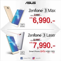 เอซุสประเทศไทย ประกาศลดราคาสมาร์ทโฟนหน้าจอ 5.5 นิ้ว พร้อมกัน 2 รุ่น ASUS ZenFone 3 Max (ZC553KL) จากราคาปกติ 7,990 บาท เหลือ 6,990 บาท และ Zenfone 3 Laser Laser (ZC551KL) จากราคา 8,990 บาท เหลือ 7,990 บาท