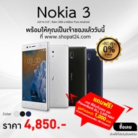 ShopAt24 เปิดจำหน่ายสมาร์ทโฟนรุ่นใหม่ล่าสุด Nokia 3 ที่มาพร้อมกับความคุ้มค่ารองรับสองซิม หน้าจอขนาดใหญ่ 5” ลื่นไหลด้วยแรม 2GB พร้อมระบบปฏิบัติการ Android 7.0 Nougat พร้อมให้คุณเป็นเจ้าของแล้ววันนี้ในราคาสบายกระเป๋า 4,850 บาท สามารถสั่งซื้อได้ตั้งแต่บัดนี้เป็นต้นไป