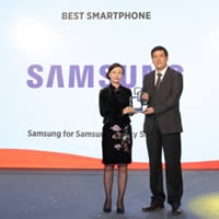 คนขวาในภาพคือคุณ Tong Wang รองประธานฝ่ายบริหาร Samsung Electronics สาขาประเทศจีนขึ้นเวทีเป็นผู้รับมอบรางวัลนี้