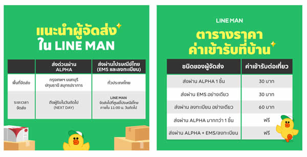 LINE MAN บริการผู้ช่วยในชีวิตประจำวันคนไทย ภายใต้แนวธุรกิจ O2O (ออนไลน์สู่ออฟไลน์) พร้อมตอบโจทย์การส่งพัสดุแบบครบวงจร ด้วยการเพิ่มตัวเลือกวิธีการส่งแบบ “ลงทะเบียน” ครอบคลุมการส่งเอกสาร พัสดุในทุกรูปแบบทั้งสำหรับพ่อค้า แม่ค้าหรือบุคคลทั่วไป รวมถึงบริษัท SME ไม่ว่าคุณจะเป็นใคร ก็สามารถส่งเอกสาร พัสดุได้ง่ายๆ ปลอดภัย ถึงทั่วไทยในราคาสุดประหยัดผ่าน LINE MAN