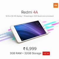 Xiaomi สาขาอินเดียเปิดตัวสมาร์ทโฟน Redmi 4A เวอร์ชั่น RAM 3GB + ROM 32GB ซึ่งอัพเกรดสเปกขึ้นจากเวอร์ชั่นปกติที่มี RAM 2GB และพื้นที่เก็บข้อมูลในเครื่อง 16GB