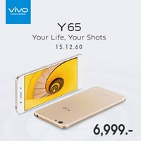 ในราคาเพียง 6,999 บาทเท่านั้น มีให้เลือก 2 สี สีทอง (Gold) และ สีดำ (Matte Black) วางจำหน่ายพร้อมกันทั่วประเทศในวันที่ 15 ธันวาคม 2560 สามารถเลือกซื้อ Vivo Y65 ได้ที่ Vivo Brand shop ทุกสาขาทั่วประเทศ และตัวแทนจำหน่ายสมาร์ทโฟนชั้นนำทั่วประเทศ ดูรายละเอียดเพิ่มเติมได้ทาง www.vivo.com