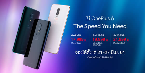 ส่วน OnePlus 6 ก็เปิดตัวอย่างเป็นทางการในประเทศไทยแล้ว ชูจุดเด่นดีไซน์สวยเป็นเอกลักษณ์ พร้อมขุมพลัง Snapdragon 845 และพื้นที่เก็บข้อมูลภายในแบบ UFS 2.1 โดยยังมีหน้าจอแสดงผลขนาดใหญ่มากถึง 6.28 นิ้วแบบ AMOLED ครอบทับกระจก Gorilla Glass 5 มีเซ็นเซอร์สแกนลายนิ้วมือกับสแกนใบหน้า ซึ่งมีระบบเชื่อมต่อครบครัน อาทิ 4G LTE Cat 16., 2x2 MIMO, Wi-Fi 802.11 a/b/g/n/ac, 2.4G/5G, GPS, Glonass, Bluetooth 5.0 กับเลนส์กล้องหลังแบบ Dual Camera ซึ่งมีความละเอียด 16MP เซ็นเซอร์ Sony IMX 519 ระบบจับโฟกัส DCAF กับระบบป้องกันภาพสั่นไหวทั้ง OIS/EIS เลนส์ที่สองความละเอียด 20MP เซ็นเซอร์ Sony IMX 376K ระบบจับโฟกัส PDAF กับรูรับแสง f/1.7 ทั้งสองเลนส์