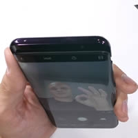 สุดท้ายทางด้านหลัง ก็สามารถแกะออกมาได้ง่ายๆ แม้ว่าจะทำได้ดีในการทนทานจากของมีคม โดยภายในจะเห็นการทำงานของส่วนสไลด์กล้องหน้าและหลัง รวมถึงแบตเตอรี่ ซึ่ง JerryRigEverything ก็แนะนำให้ใส่เคสเอาไว้เป็นทางเลือกที่ดีที่สุด