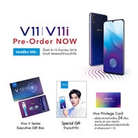 หลังจากที่ได้เปิดตัวไปอย่างเป็นทางการเมื่อวันที่ 5 กันยายน 2561 กับงาน Vivo V11 / V11i Launch Event พร้อมเปิดราคา Vivo V11 อยู่ที่ 13,999 บาท / Vivo V11i ราคา 9,999 บาท โดยมีให้เลือกถึง 2 สีด้วยกัน ได้แก่ Nebula สีที่แสดงถึงความโดดเด่น และ Starry Night สีที่ให้ความรู้สึกถึงความหรูหราของตัวเครื่อง สำหรับท่านที่สนใจโดยสามารถ Pre - Order เป็นเจ้าของก่อนใคร สามารถ Pre-Order ได้ตั้งแต่วันที่ 8 - 15 กันยายน 2561 โดยมีรายละเอียดเงื่อนไขการสั่งจอง ดังนี้