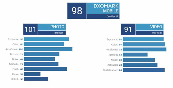 DxOMark ผู้จัดอันดับสมาร์ทโฟนกล้องสวยชื่อดังได้ออกมาเผยคะแนนหลังการทดสอบ OnePlus 6T เป็นที่เรียบร้อย โดยทำคะแนนรวมอยู่ที่ 98 คะแนน มากกว่า OnePlus 6 อยู่ 2 คะแนน และรั้งอันดับ 10 ร่วมกับ Google Pixel 2 ซึ่งแบ่งเป็นคะแนนถ่ายภาพนิ่ง 101 คะแนน และคะแนนถ่ายวิดีโอที่ 91 คะแนน