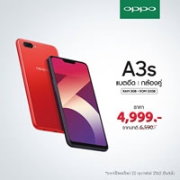 OPPO ประเทศไทยจัดประกาศลดราคาสมาร์ทโฟนรุ่น Hot Hit อย่าง "A3s" โมเดล RAM 3GB + ROM 32GB เหลือแค่เพียง 4,999 บาทเท่านั้น จากปกติ 6,590 บาท สำหรับจุดเด่นของรุ่นดังกล่าวคือ เฉดสีแดงและม่วง หน้าจอที่มีขนาดใหญ่มากที่สุดถึง 6.2 นิ้วในอัตราส่วน 19:9 โดยด้านหลังจะครอบทับกระจก เมื่อแสงตกกระทบจะให้แสดงเฉดสีในลักษณะต่างกัน นั่นเป็นเพราะเลเยอร์สีที่ออปโป้ดีไซน์ไว้ การใช้งานก็เรียกได้ว่าเล่นเกม หรือท่องโซเชียลต่อเนื่องกับแบตเตอรี่ความจุ 4230mAh พร้อมลูกเล่นต่างๆ กับแพลตฟอร์ม Color OS 5.1 พื้นฐานแอนดรอยด์เวอร์ชั่น 8.1 (Oreo)