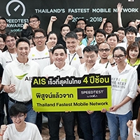 นายสมชัย เลิศสุทธิวงค์ ประธานเจ้าหน้าที่บริหาร และทีมงานวิศวกรเอไอเอส ร่วมยืนยันความมุ่งมั่นพัฒนาเครือข่ายเพื่อคนไทยอย่างไม่หยุดยั้ง หลัง Ookla® Speedtest® ผู้ให้บริการทดสอบความเร็วอินเทอร์เน็ตอันดับต้นของโลก ประกาศให้ เอไอเอส เป็น อันดับ 1 เครือข่ายมือถือที่เร็วที่สุดในไทย ถึง 4 ปีซ้อน ตั้งแต่ ปี 2015 – 2018