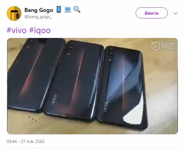 อย่างแรกจากข้อมูลของ iQOO ที่ปล่อยออกมาทำให้เราเห็นถึงความเร็วในชาร์จที่ชาร์จเพียง 47 นาทีก็ได้แบตเตอรี่เต็ม 100% ต่อมาเป็นคลิปวิดีโอ Hands On ที่ปล่อยออกมาทางทวิตเตอร์ bang_gogo_ เผยให้เห็นดีไซน์และตัวเครื่อง 2 สี เป็นแดงและน้ำเงิน ทั้งยังมีหน้าจอแบบหยดน้ำ และกล้องหลัง 3 เลนส์อีกด้วย