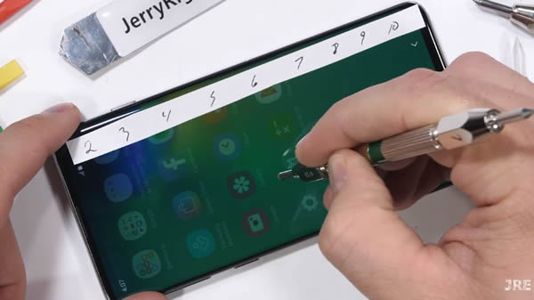 Zack Nelson ได้ทำการทำสอบ 4 ขั้นตอนแบบเดิม ได้แก่ การขูดหน้าจอด้วยแท่งเหล็กในระดับต่างๆ (2-10), การใช้คัดเตอร์ขีดส่วนต่างๆ รอบตัวเครื่อง, ใช้ไฟแช็คเผาหน้าจอ และการหักตัวเครื่องโชว์ โดยมีอีก 1 การทดสอบที่ต่างออกไป คือ การขูดหน้าจอบริเวณเทคโนโลยีสแกนลายนิ้วมือ Ultrasonic ว่าจะยังใช้ได้ดีหรือไม่เมื่อเกิดรอย
