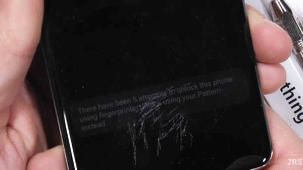 การทดสอบต่อมาเป็นการทดสอบเฉพาะกิจของ Galaxy S10 คือการใช้แท่งเหล็กขูดหน้าจอบริเวณการสแกนนิ้วให้เกิดรอย ผลปรากฏว่าเทคโนโลยี Ultrasonic ยังคงใช้งานได้ปกติเมื่อเกิดรอยเบาๆ เช่น รอยขนแมว เป็นต้น อย่างไรก็ตาม เมื่อหน้าจอเริ่มเป็นรอยมากขึ้นจนถึงขั้นเกือบร้าว การสแกนนิ้วก็จะใช้งานต่อไม่ได้ ต่างจากแบบ Optical ที่ยังคงใช้งานได้ปกติ