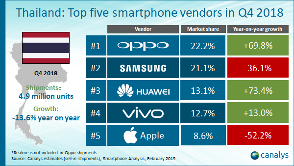 เรียกได้ว่า OPPO มีการพัฒนาไปอย่างมากทั้งเรื่องผลิตภัณฑ์ของตัวเอง รวมไปถึงยอดขายที่เราเกริ่นไปตอนต้นที่ OPPO ได้แซง Samsung เป็นครั้งแรกขึ้นแท่นผู้นำด้านการจำหน่ายสมาร์ทโฟนในประเทศไทยกว่าเกือบ 1.1 ล้านเครื่องในไตรมาสที่ 4 ของปี 2018 พร้อมครองส่วนแบ่งตลาดถึง 22.2% ซึ่งเป็นการแสดงถึงการเติบโตอย่างยิ่งใหญ่ของบริษัท เพราะประเทศไทยเองก็เป็นตลาดสมาร์ทโฟนที่ใหญ่เป็นอันดับสองในเอเชียตะวันออกเฉียงใต้เลยทีเดียว