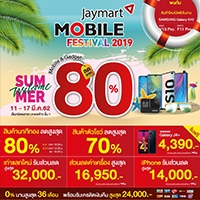 บริษัท เจมาร์ท โมบาย จำกัด จัดแคมเปญต้อนรับซัมเมอร์ กระตุ้นยอดขายมือถือและแกดเจ็ท (Gadget) ในงาน “Jaymart Mobile Festival 2019 Welcome Summer Mobile & Gadget ซัมเมอร์นี้ ช้อปสนั่นลดร้อนแรงสูงสุด 80%” ด้วยโปรโมชั่นสุดพิเศษสมาร์ทโฟนเก่าแลกใหม่ รับส่วนลดสูงสุด 32,000 บาท ผ่อน 0% นานสูงสุด 36 เดือน พร้อมรับเครดิตเงินคืนสูงสุด 24,000 บาทกับบัตรที่ร่วมรายการ และ iPhone รับส่วนลดพิเศษสูงสุด 14,000 บาท* และส่วนลดค่าเครื่องสูงสุด 16,950 บาท เมื่อเปิดเบอร์ใหม่ สมัครแพ็คเกจ AIS สิทธิพิเศษสำหรับสมาชิก Enjoy Card รับคูปองส่วนลด 500 บาท (ภายในงาน) รับคะแนน X2 พร้อมรับส่วนลด 100 บาท เมื่อใช้คะแนนสะสม 1,000 คะแนน คุ้มสุด!!! สมาร์ทโฟนสุดฮิต เริ่มต้นเพียง 790 บาท*