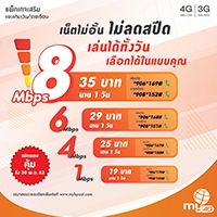 my by CAT บริการโทรศัพท์มือถือและอินเทอร์เน็ต 4G และ 3G จากบริษัท กสท โทรคมนาคม จำกัด (มหาชน) ตอกย้ำกระแสตอบรับแพ็กเกจ “เน็ตไม่อั้น” เจาะกลุ่มคนรุ่นใหม่สายโซเชียลให้เล่นอินเทอร์เน็ตไม่อั้น ทั้งวัน ไม่ลดสปีด ด้วยการต่ออายุแพ็กเกจเสริมให้สมัครใช้งานกันได้ยาวๆ โดยมีสปีดความเร็ว แรง ให้เลือกใช้ตามต้องการตั้งแต่ 1 Mbps ในราคาเริ่มต้นเพียงวันละ 19 บาท, 4 Mbps ราคา 25 บาทต่อวัน, 6 Mbps ราคา 29 บาทต่อวัน และโปรโมชั่นสุดคุ้มกับความเร็ว 8 Mbps ในราคาเพียง 35 บาทต่อวัน นอกจากนี้ ยังสามารถเลือกได้ทั้งแบบรายสัปดาห์ รายเดือน และเหมาจ่าย 6 เดือนอีกด้วย