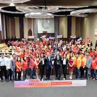 True นำทีมโดย นายเจริญ ลิ่มกังวาฬมงคล ผู้อำนวยการบริหารอาวุโสกลุ่ม ด้านการบริหารจัดการระดับภูมิภาค ภาคเหนือ ภาคตะวันออกเฉียงเหนือ ภาคตะวันออก และภาคกลาง พร้อมด้วยนายมนัสส์ มานะวุฒิเวช ผู้จัดการทั่วไปด้านการบริหารจัดการระดับภูมิภาค ภาคตะวันออก จัดงานสัมมนาพันธมิตรคู่ค้า True Get Together Dealer Conference 2019 รวมพลังเสริมแกร่งให้พันธมิตรคู่ค้าภาคตะวันออก พร้อมขอบคุณที่ร่วมกันผลักดันสร้างยอดขายให้กลุ่มทรูเติบโตกันมาตลอดปี ซึ่งภายในงานมีกิจกรรมแนะนำผลิตภัณฑ์และเทคโนโลยีใหม่ล่าสุด อาทิ กล่อง TrueID Box รวมถึง Demo device เพื่อให้เพื่อนคู่ค้าทดลองเครื่อง พร้อมให้คำแนะนำต่างๆ บูธO2O เชิญชวนโหลด True Money และ TrueID พร้อมเล่นเกม ผ่าน TrueID box บูธนวัตกรรม 5G จาก Huawei โชว์เทคโนโลยี AI สแกนใบหน้าแทนบัตรประชาชน และบูธพันธมิตรอีกมากมาย พร้อมสรุปยอดขายของเพื่อนคู่ค้าในภาคตะวันออก เพื่อกระตุ้นและสร้างแรงจูงใจให้พัฒนาธุรกิจสู่ความเป็นเลิศและสร้างความเชื่อมั่นในการทำงานร่วมกันระหว่างกลุ่มทรูและเพื่อนคู่ค้า ณ โรงแรมบางแสนเฮอริเทจ จ.ชลบุรี
