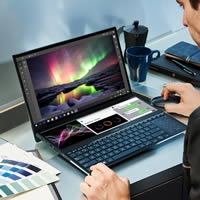 สำหรับ ZenBook Duo (UX481) ขนาด 14 นิ้ว เพื่อการพกพาที่สะดวกยิ่งขึ้น มาพร้อมจอแสดงผลแบบขอบจอบางทั้งสี่ด้าน (Four-sided NanoEdge) ความคมชัดระดับ FHD เช่นเดียวกับ ScreenPad Plus ขับเคลื่อนด้วยซีพียู up to Intel Core i7 และ GeForce MX250 GPU
