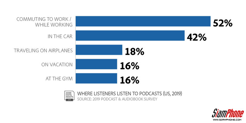 โดยรวมแล้ว กว่าครึ่งของผู้ฟัง (52%) ระบุว่าตนเองฟังพอดคาสต์ระหว่างเดินทางไปทำงานหรือในขณะทำงาน และ 42% ฟังขณะอยู่ในรถยนต์
