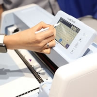 เครื่องสแกนแอนด์คัท รุ่น ‘SDX1200’ สแกนและตัดแบบอัตโนมัติมาพร้อมกับ ระบบ Auto cut ที่ตัดวัสดุต่างๆ อาทิ กระดาษ, ผ้า, แผ่นโฟม, แผ่นพลาสติกและวัสดุพื้นเรียบอื่นๆ ได้หนาขึ้นกว่าเดิม ตัดได้ลึกถึง 3 มิลลิเมตร เป็นรุ่นแรกในอุตสาหกรรม SME ที่ทำได้ เหมาะสำหรับกลุ่มงานดีไซน์ประเภท Prototype หรือจะเป็นชิ้นงานลายฉลุ อีกหนึ่งสิ่ง คือ Auto Blade หรือระบบเลือกขนาดใบมีดอัตโนมัติ ที่ตัวเครื่องจะเช็คเองว่าความหนาของผ้าหรือไวนิล และจะเลือกความลึกของมีดให้เหมาะสมโดยอัตโนมัติ และยังสามารถอ่านไฟล์ Embroidery ได้ เช่นการสร้างสรรค์แพทเทิร์นปัก , ไวนิล หรือลายฉลุเป็นแพทเทิร์นเดียวกัน สามารถทำได้ ความพิเศษของอุปกรณ์เสริมอย่าง Roller Feeder ที่ตัดได้ยาวสูงสุดถึง 72 นิ้ว ช่วยในการทำงานได้หลากหลายขึ้น
