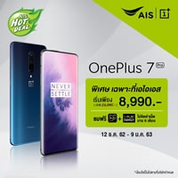 โปรโมชัน AIS Hot Deal ให้เป็นเจ้าของ OnePlus 7 Pro รับส่วนลดค่าเครื่องสูงสุด 6,000 บาท เมื่อสมัครแพ็กเกจรายเดือนเริ่มต้นที่ 449 บาทต่อเดือน โดยต้องชำระค่าบริการล่วงหน้า 1,000 บาท