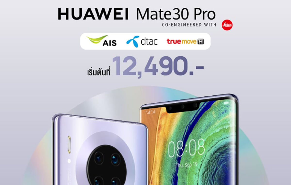 งานนี้ใครพลาดมีน้ำตาตก เมื่อ 3 ค่ายผู้ให้บริการมือถือชื่อดังทั้ง AIS, Dtac และ Truemove H พร้อมใจส่งโปรสุดคุ้มสำหรับ Huawei Mate 30 Pro สุดยอดสมาร์ทโฟนที่ให้มากกว่าเป็นสมาร์ทโฟน ด้วยความฉลาดของชิปเซ็ต Kirin 990 รวมไปถึงยืนหนึ่งเรื่องการใช้งานกล้องถ่ายรูป ด้วยการการันตีสุดมั่นใจจาก DxOMark โดยทั้งหมดตอนนี้สามารถหาซื้อได้แล้วด้วยราคาเริ่มต้น 12,490 บาทเท่านั้น