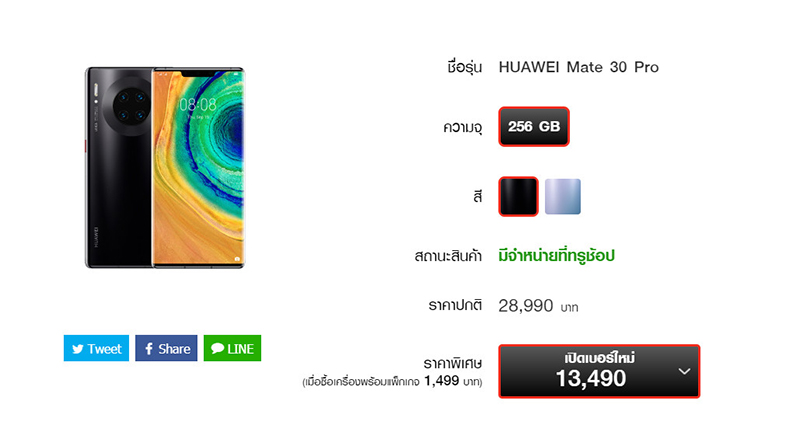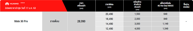 Truemove H จะมีตัวเลือกแพ็กเกจรายเดือนที่หลากหลาย แต่ตัวเลือกที่คุ้มที่สุดจะเป็นแพ็กเกจรายเดือน 1,499 บาท ไม่ว่าจะเป็นลูกค้าเปิดเบอร์ใหม่, ย้ายค่ายเบอร์เดิม, เปลี่ยนเติมเงินเป็นรายเดือน, ลูกค้าปัจจุบันแบบรายเดือน ก็มีสิทธิซื้อ Huawei Mate 30 Pro ในราคาพิเศษ 13,490 บาท จากราคาเต็ม 28,990 บาท เรียกว่าประหยัดไปกว่า 15,550 บาทเลยทีเดียว แต่ต้องจ่ายค่าบริการล่วงหน้า 4,500 บาท มีระยะสัญญา 12 เดือน