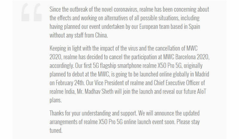 ตามกำหนดเดิม realme จะเข้าร่วมการประชุมมือถือโลกในงาน Mobile World Congress ที่บาร์เซโลนาเป็นครั้งแรก แต่จากความกังวลของการแพร่ระบาสของเชื้อไวรัสโคโรน่า จึงได้ยุติการจัดงานไป ซึ่งทาง realme แก้ไขสถานการณ์ด้วยการเปิดตัว realme X50 Pro 5G ผ่านช่องทางออนไลน์แทน