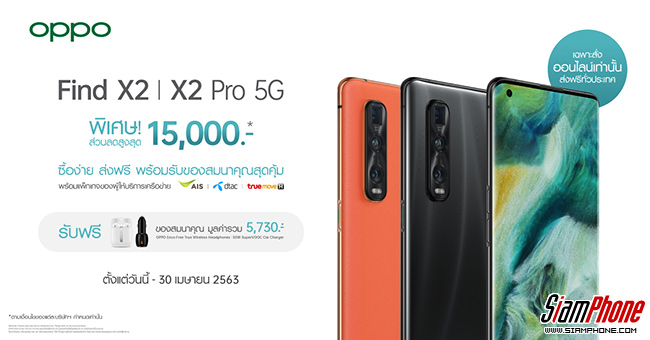 เมื่อซื้อ OPPO Find X2 5G พร้อมแพ็กเกจผู้ให้บริการเครือข่าย รับส่วนลดสูงสุด 15,000 บาท และรับฟรี OPPO Enco Free True Wireless Headphones มูลค่า 3,999 บาท และเมื่อซื้อ OPPO Find X2 Pro 5G พร้อมแพ็กเกจผู้ให้บริการเครือข่าย ลดสูงสุด 11,000 บาท รับฟรี OPPO Enco Free True Wireless Headphones และ 50W SuperVOOC Car Charger มูลค่ารวม 5,730 บาท! ตั้งแต่วันนี้ – 30 เมษายนนี้เท่านั้น โดยเงื่อนไขเป็นไปตามที่แต่ละบริษัทฯ กำหนด