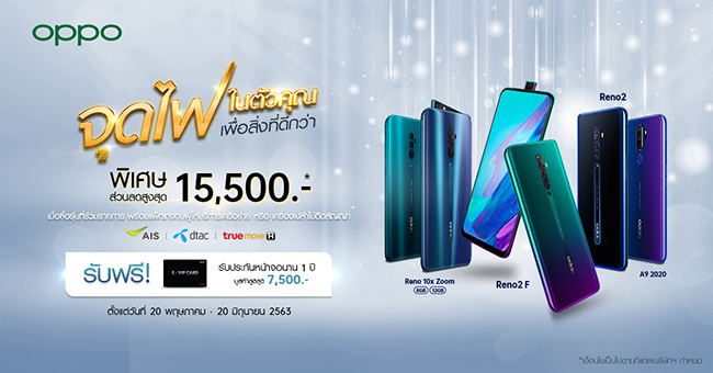 OPPO จัดแคมเปญ “จุดไฟในตัวคุณ เพื่อสิ่งที่ดีกว่า” ด้วยโปรโมชั่น เมื่อซื้อพร้อมแพ็กเกจผู้ให้บริการเครือข่าย AIS, dtac และ TrueMove H หรือ เมื่อซื้อเครื่องเปล่าแบบไม่ติดสัญญา ในรุ่น OPPO Reno2 F , OPPO Reno 2 , OPPO Reno 10x Zoom RAM 8GB , OPPO Reno 10x Zoom RAM 12GB และ OPPO A9 2020 รับส่วนลดสูงสุด 15,500 บาท พร้อมรับฟรี! E-VIP Card รับประกันหน้าจอ 1 ปี มูลค่าสูงสุด 7,500 บาท วันนี้ - 20 มิถุนายน 2563 โดยรายละเอียดมีดังนี้