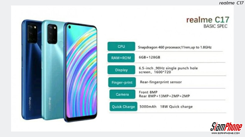realme C17 มีจุดเด่นที่ หน้าจอแบบ Punch Hole กล้องหน้า 8 ล้านพิกเซล Refresh Rate สูงสุดที่ 90Hz พร้อม RAM 6GB + ROM 128GB ชิปเซ็ต Qualcomm Snapdragon 460 แบตเตอรี่ความจุ 5000 mAh และรองรับชาร์จเร็ว 18W