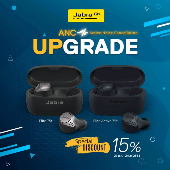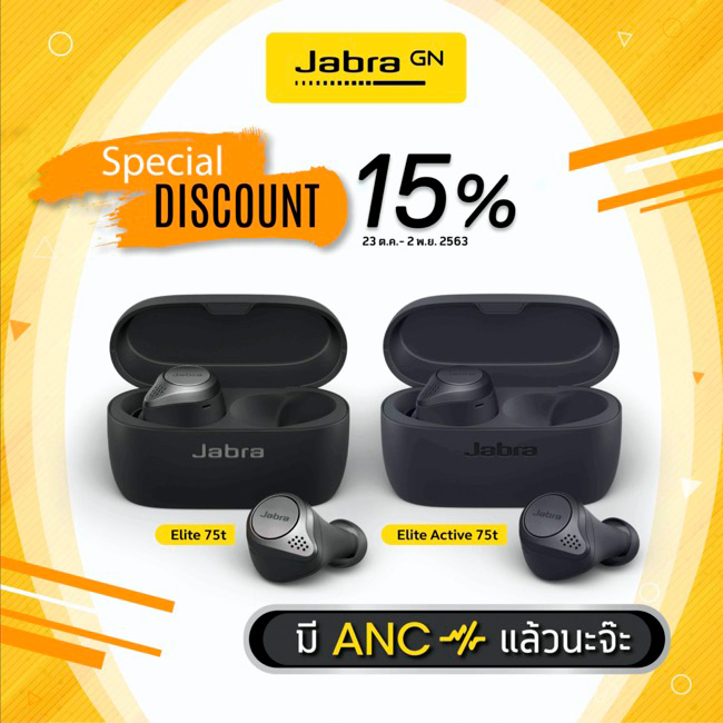 Jabra Elite 75t และ Jabra Elite Active 75t สามารถอัพเดทเฟิร์มแวร์ของฟังก์ชั่น ANC หรือ Active Noise Cancellation ผ่านทางแอปฯ Jabra Sound+ ได้ฟรีแล้ววันนี้ พร้อมมอบโปรโมชั่นสุดพิเศษด้วยส่วนลดสูงสุดถึง 15% สำหรับผู้ที่ซื้อหูฟัง Jabra Elite 75t และ Jabra Elite Active 75t ตั้งแต่วันนี้ – 2 พฤศจิกายน 2563