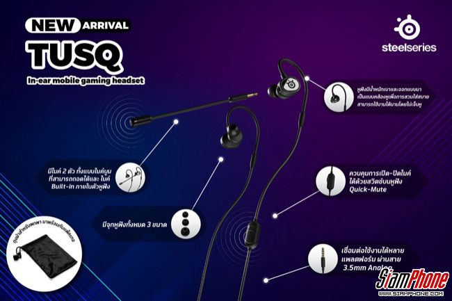 TUSQ ยังโดดเด่นด้วยไมโครโฟนถึง 2 ตัว ทั้งแบบไมค์บูมที่สามารถถอดได้ และไมค์ Built-in ภายในหูฟัง เพื่อการสนทนาในเกมที่ชัดเจนยิ่งขึ้น พร้อมกับไดร์เวอร์ขับเสียงแบบไดนามิก ซึ่งจะทำให้ได้ยินทุกรายละเอียดเสียงในเกมที่เล่นอย่างคมชัดแม่นยำ และยังมีฟังก์ชั่น Ouick-Mute ที่จะช่วยให้เหล่าเกมเมอร์ควบคุมการเปิด-ปิดไมค์ได้อย่างอิสระง่ายดายบนหูฟัง ขณะที่ตัวหูฟังออกแบบมาอย่างมีสไตล์ น้ำหนักเบา พร้อมระบบกันสะเทือนรอบใบหูที่ให้ความปลอดภัย และจุกหูฟังซิลิโคน 3 ขนาด ช่วยให้สวมใส่ได้อย่างสบายและสามารถแสดงฝีมือในการเล่นเกมได้ยาวนานโดยไม่เจ็บหู นอกจากนี้ ยังมาพร้อมถุงผ้าเก็บหูฟัง สามารถพกพาไปใช้งานได้สะดวกวางจำหน่ายราคา 1,690 บาท