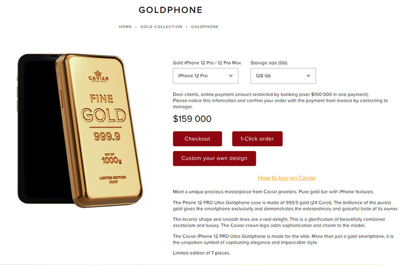 สำหรับ Goldphone จะถูกแบ่งออกเป็น 2 โมเดลคือ Goldphone (iPhone 12 Pro) และ Goldphone (Samaung S21) ราคาเริ่มต้นที่ 4.9 ล้านบาทและ 5.2 ล้านบาทตามลำดับ ทั้ง 2 โมเดลจะมีฟังก์ชั่นการใช้งานเหมือนสมาร์ทโฟนทั่วไปเพียงแต่มีฝาหลังเป็นทองคำแท้แบบ 24k ที่มีน้ำหนักรวม 1 กิโลกรัม โดยปกติทาง Caviar จะใช้เป็นทองคำ 18K ที่เหมาะสมกับการขึ้นรูปสมาร์ทโฟนมากกว่า เปิดให้สั่งจองเป็นเจ้าของแบบจำกัดเพียง 7 เครื่องบนโลกเท่านั้น ซึ่งผู้ที่สั่งจองสามารถเลือกขนาดความจุตัวเครื่องได้ตามชอบ (ราคาก็จะปรับเปลี่ยนตามขนาดความจุตัวเครื่อง)